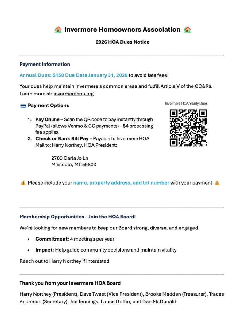 The HOA Board will continue to work with the City of Missoula to support the City’s responsibility for ensuring that the improvements to the Park and Frontage will be completed, all of the Open Spaces issues will be addressed, and to represent the best interests of the Invermere HOA.